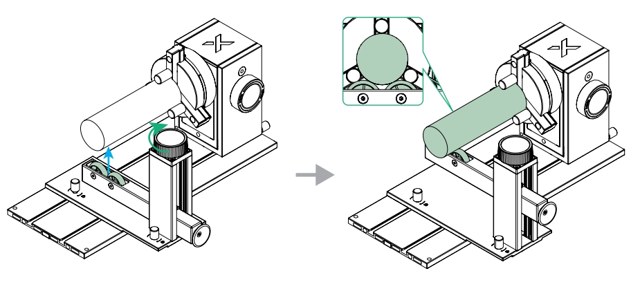 7. 旋转旋钮,调整高度,使丝杆升降组件上的两个轮子刚好抵住工件。