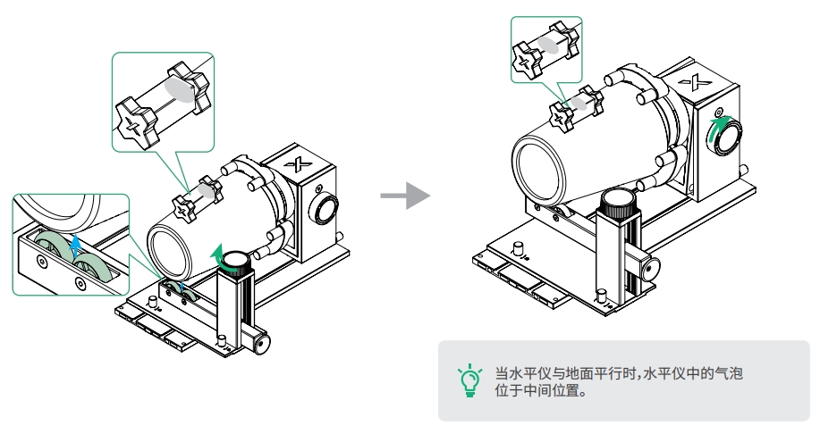 9. 旋转旋钮,调整丝杆升降组件的轮子高度。当水平仪与地面平行时,顺时针旋转旋钮以锁定角度。