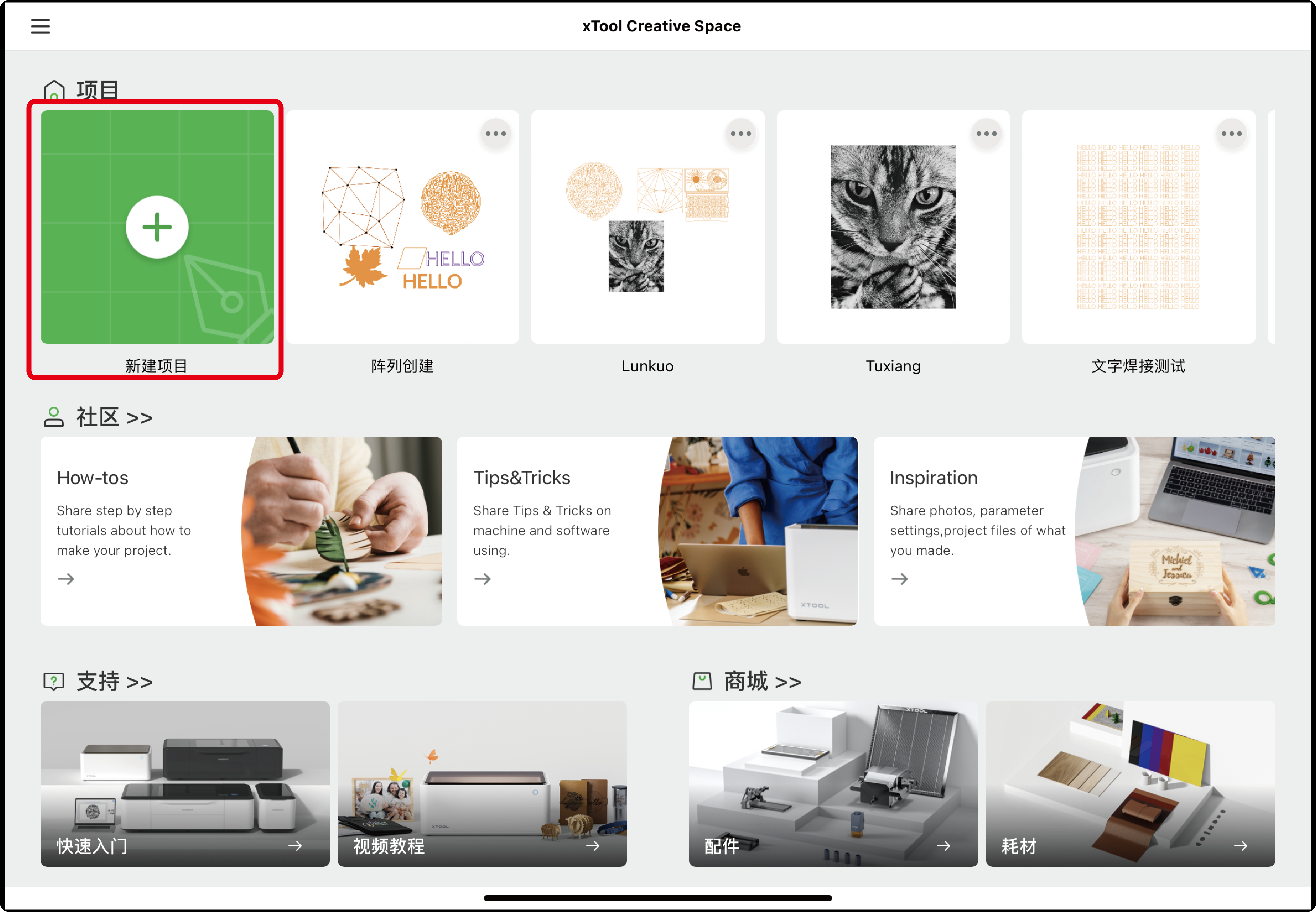 你可以使用以往保存过的项目进行加工,也可以新建一个项目,从头开始设计加工图案、设置各项参数。