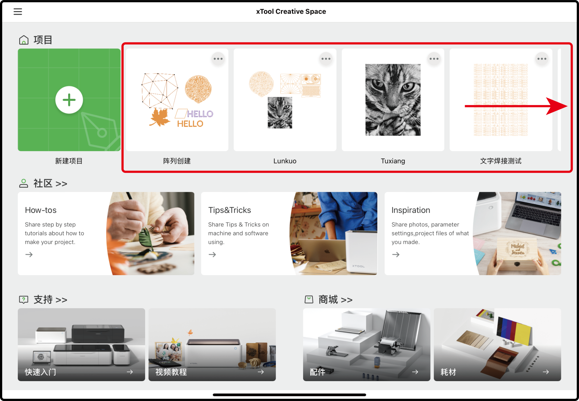 在 XCS 首页的“项目”分类下,左右滑动选择你想要加工的项目,点击打开项目。