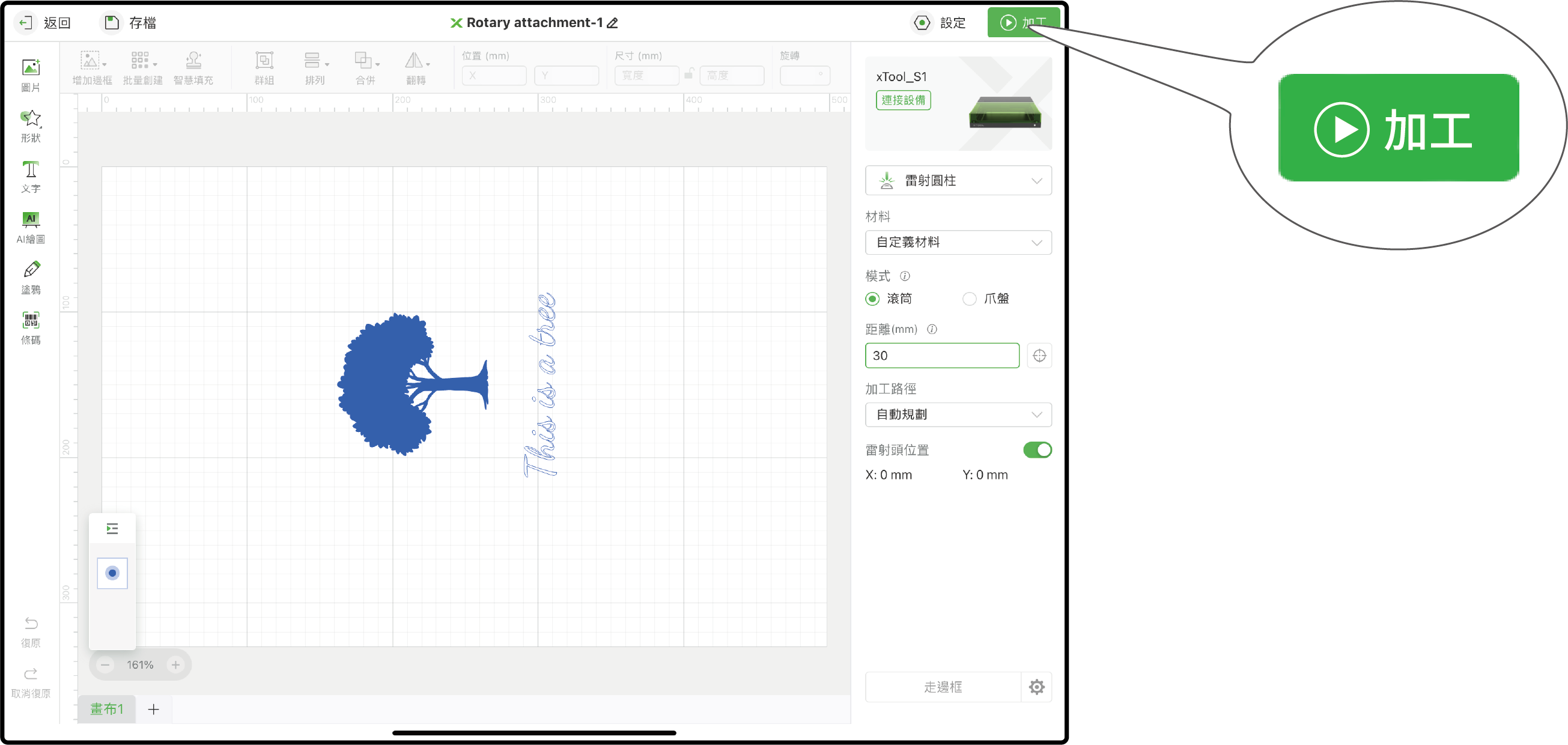 选中画布中的对象,然后在 XCS 界面右侧,为选中的对象设置加工参数。