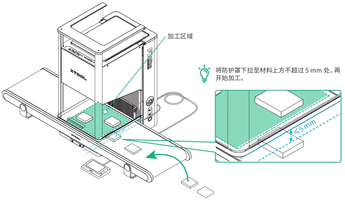 ⚠️ 大幅面加工时,加工位置为传送带中间线,材料从右向左传送,因此位于中间线左侧的材料区域将无法加工。