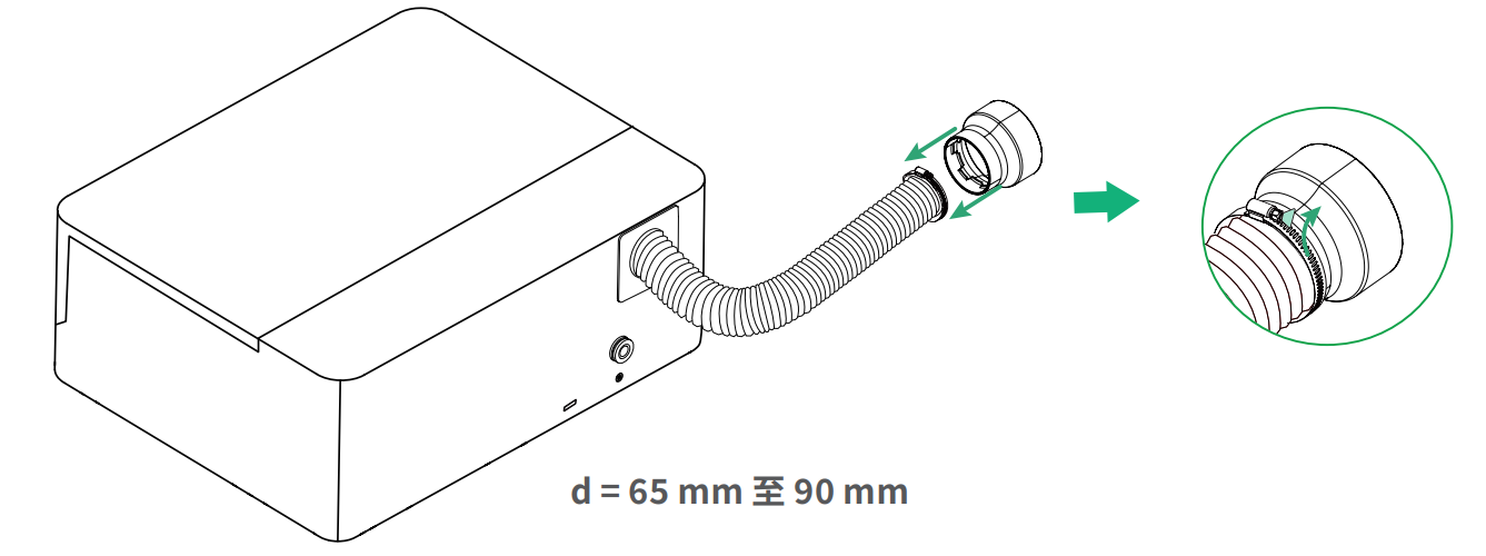 场景三:机器排烟管直径为 65 mm 至 90 mm,适用于 xTool P2, P2S, D1, 及 D1 Pro