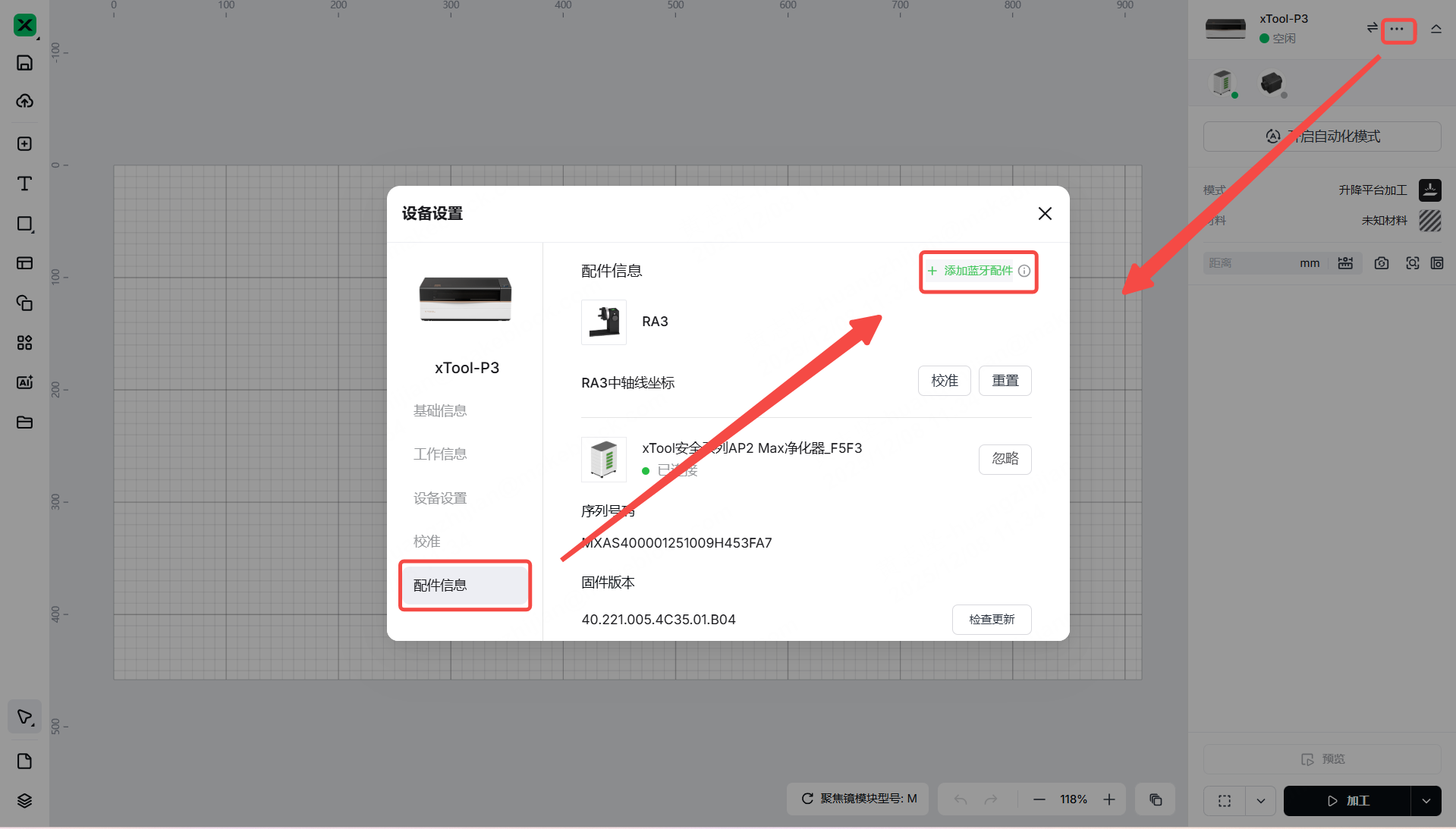 2. 在 xTool 软件中,选择“设备设置” > “配件信息”。然后单击“添加”以添加新配件。