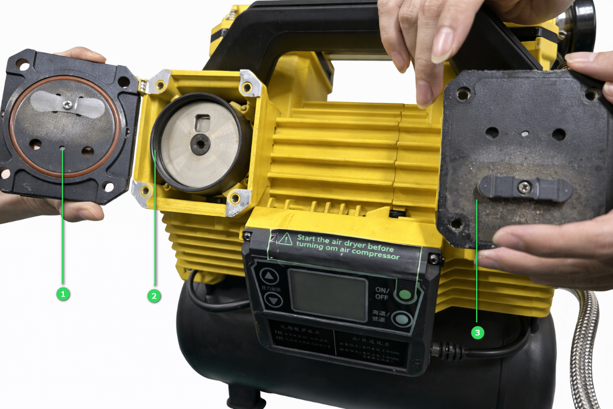 当空压机持续运行约 300-500 小时后(具体数据可能因不同工况而有所不同),其压缩机内的皮碗组件可能会磨损。若发现充气速度变慢或者发现异响,可联系客服获取新的皮碗和缸套,并根据本文操作指引完成更换。