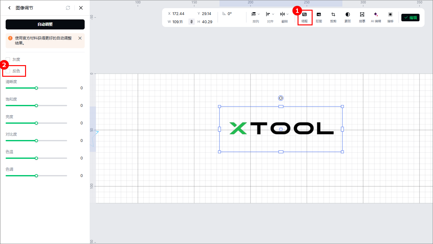 6. 如果使用深色材料,选中图像后点击“调整”,在左边栏开启“反色”功能,可以更好地预览雕刻效果。