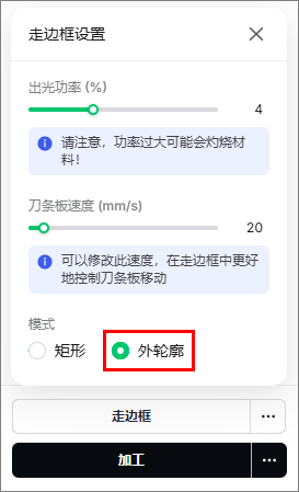 6. 点击右下方的走边框设置图标,选择“外轮廓”走边框模式。