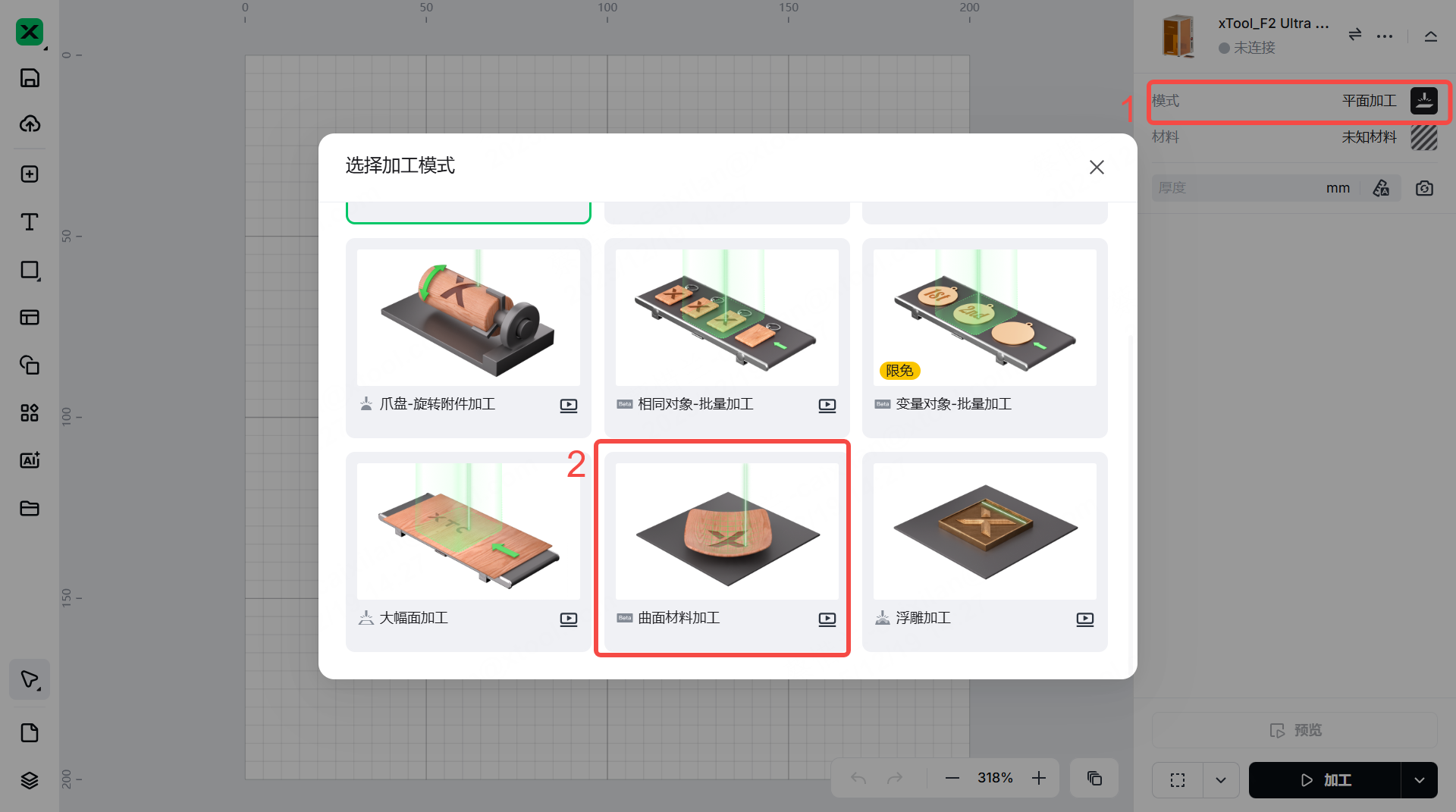 在 xTool Studio 的右上角,点击当前处理模式的名称,然后选择 “曲面材料加工”.