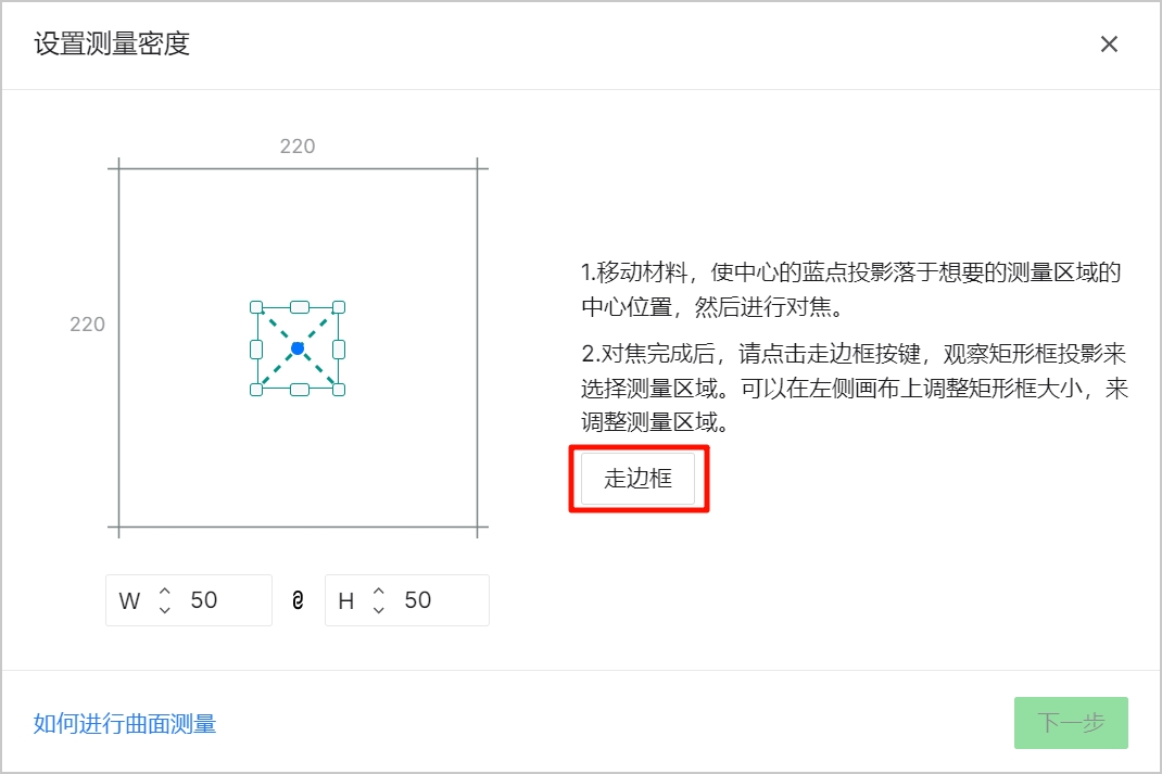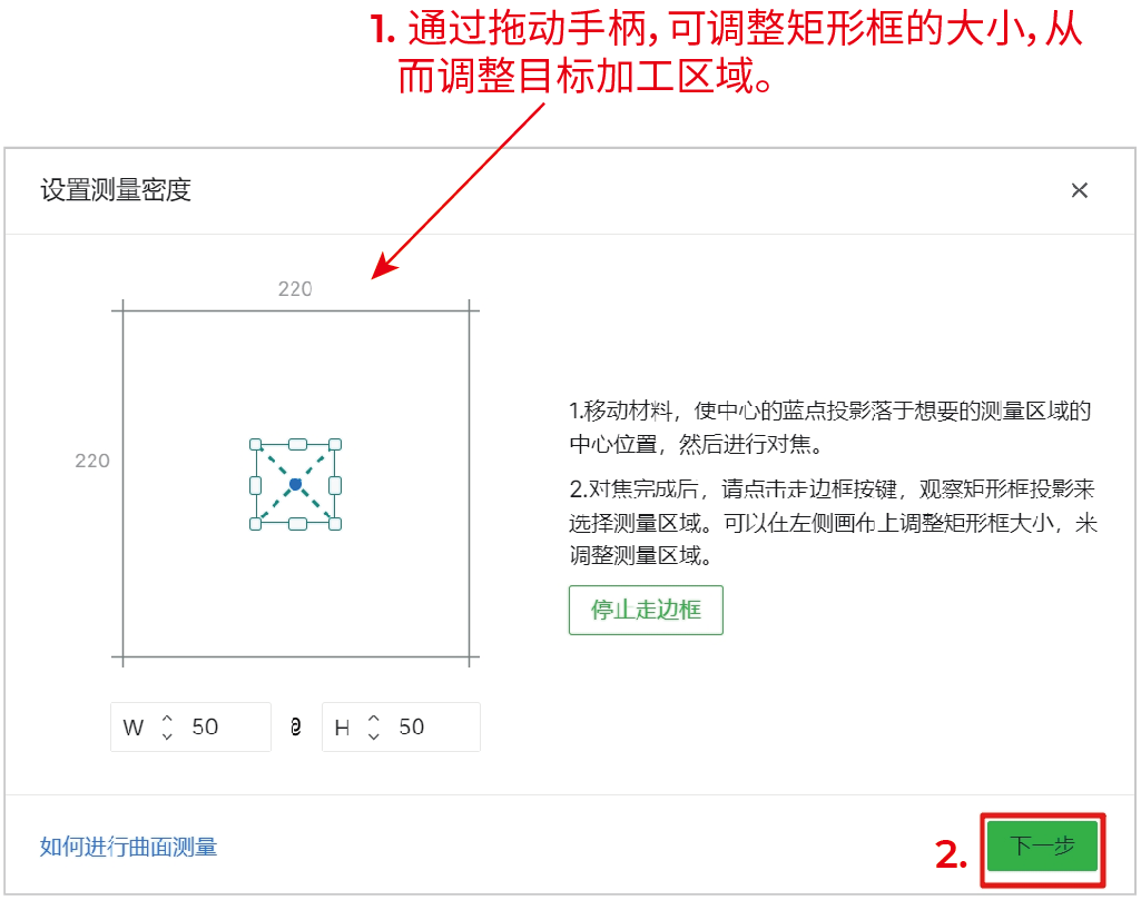 (1) xTool Studio 根据所选区域的大小提供推荐的测量密度。你可以通过更改行和列来调整测量密度.