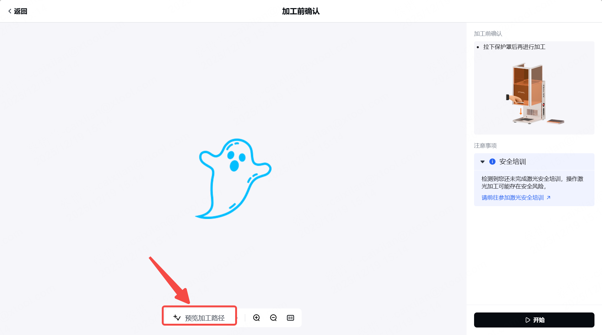 (4)关闭保护围栏。在软件右下角,点击 “开始 ”。当软件显示“准备好”时,按下触摸屏控制器上的 XTOOL 启动/停止按钮即可开始处理。