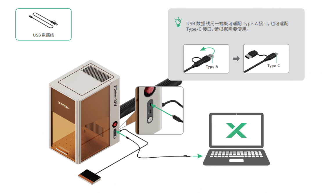 (1)用 USB 线将 xTool F2 Ultra UV 连接到你的电脑。