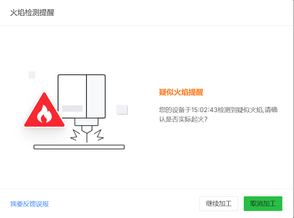 切割材料时,底板上的激光反射可能导致摄像头感知到比实际更大的火焰面积,从而触发火焰报警。