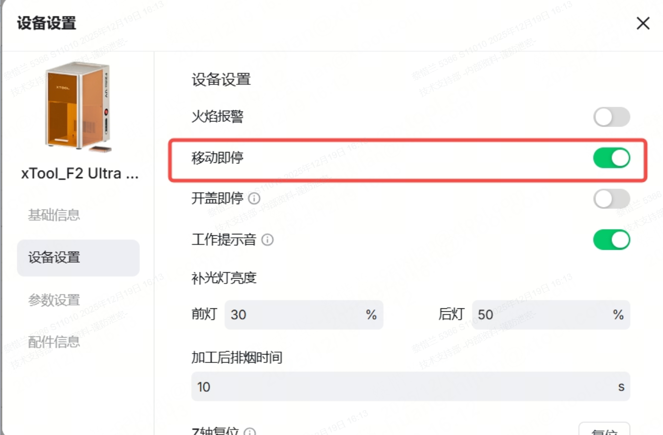 作为临时措施,你可以在 xTool Studio 的设备设置里关闭“移动即停”功能。这样机器就不会触发警报。如果你需要在支持团队完成分析前先做项目,这会很有帮助。