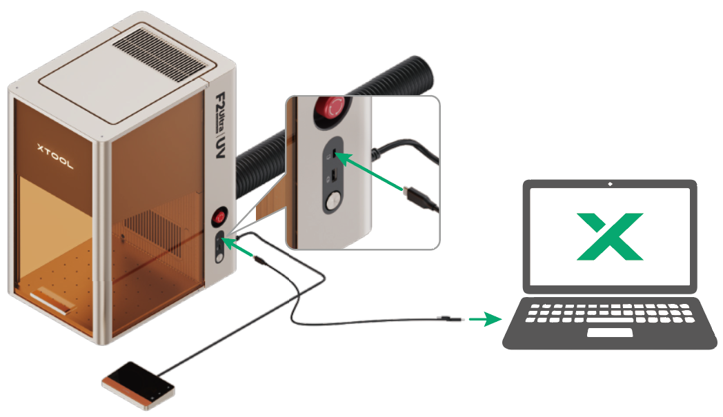 (2)使用 USB 数据线连接 xTool F2 Ultra UV 激光雕刻机与电脑,然后在软件中连接 xTool F2 Ultra UV 激光雕刻机。