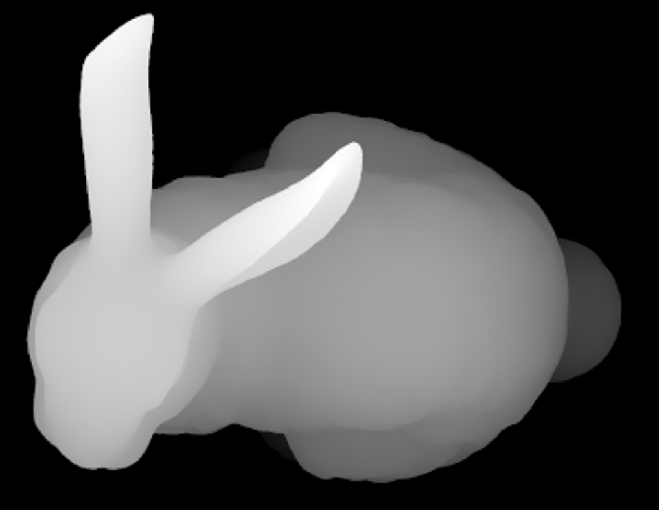 上面的斯坦福兔子是深度图。白色像素代表场景中最接近参考点的部分,黑色像素代表距离最远的部分。在这种情况下,场景中最接近的部分是兔子的耳朵。中间的灰度渐变说明头部、颈部和身体距离参考点稍远,腿部更远,而兔子的尾巴位于图像中最远的背景或最远点。冲洗时,深色是雕刻的深色部分,浅色是浅层。