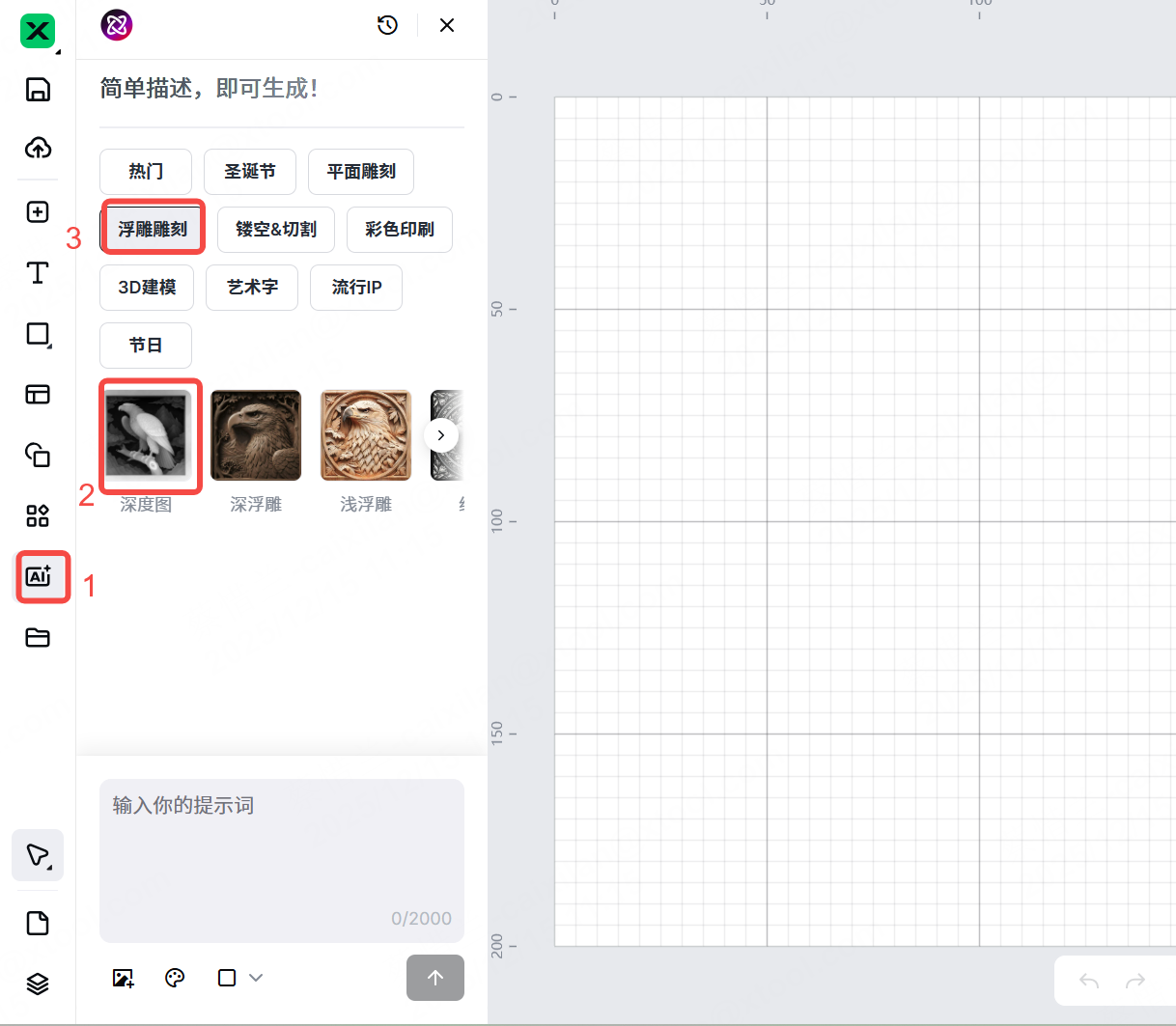 (1) 在 xTool Studio 项目编辑页面左侧,点击 AI 图标。然后选择“浮雕雕刻” 并选择一种风格。