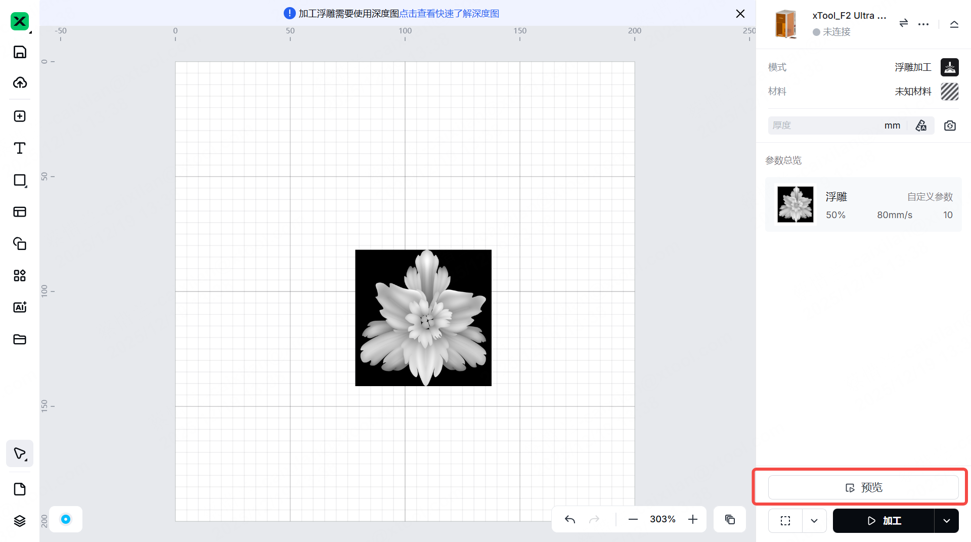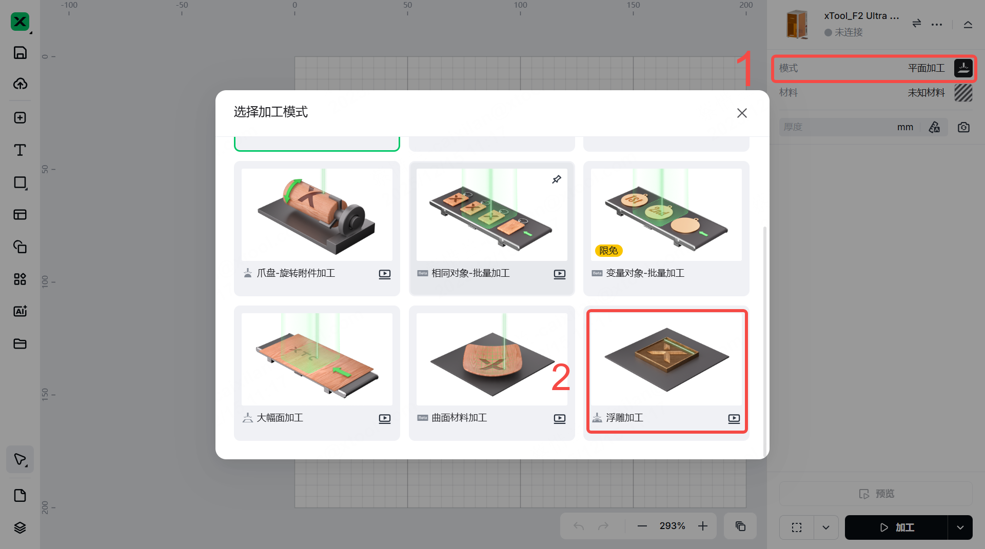 (1) 在 xTool Studio 右侧,点击“模式”,然后选择 “ 浮雕加工 ”作为加工模式。