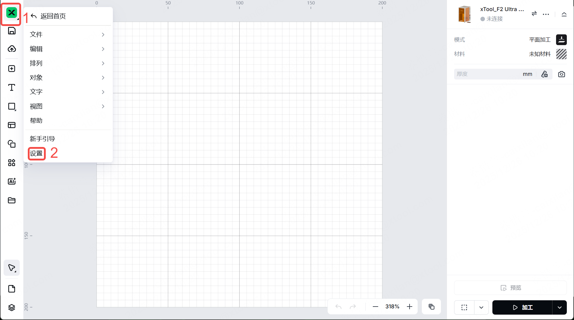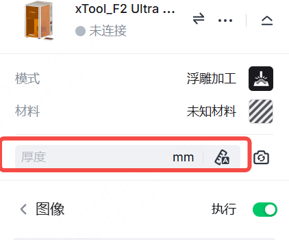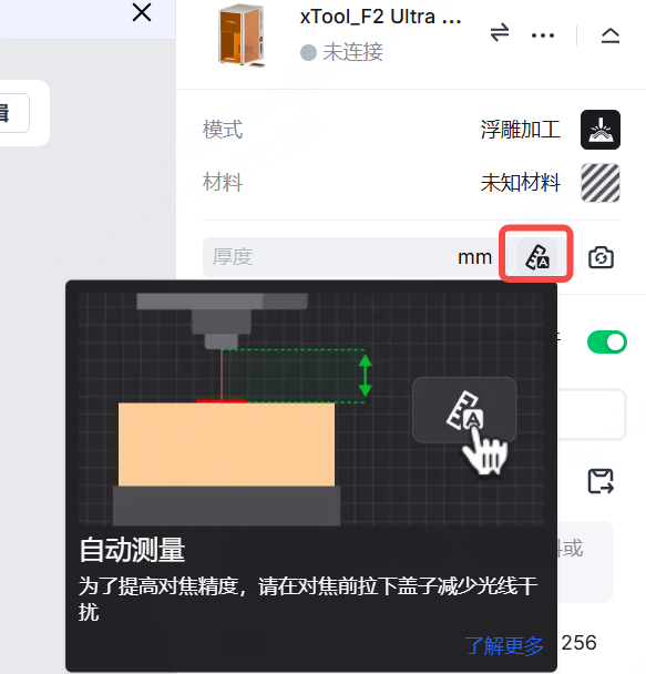 注意:xTool F2 Ultra UV 支持自动对焦和手动对焦。这里我们用手动对焦。如果你想用自动对焦,点击厚度旁边的图标。