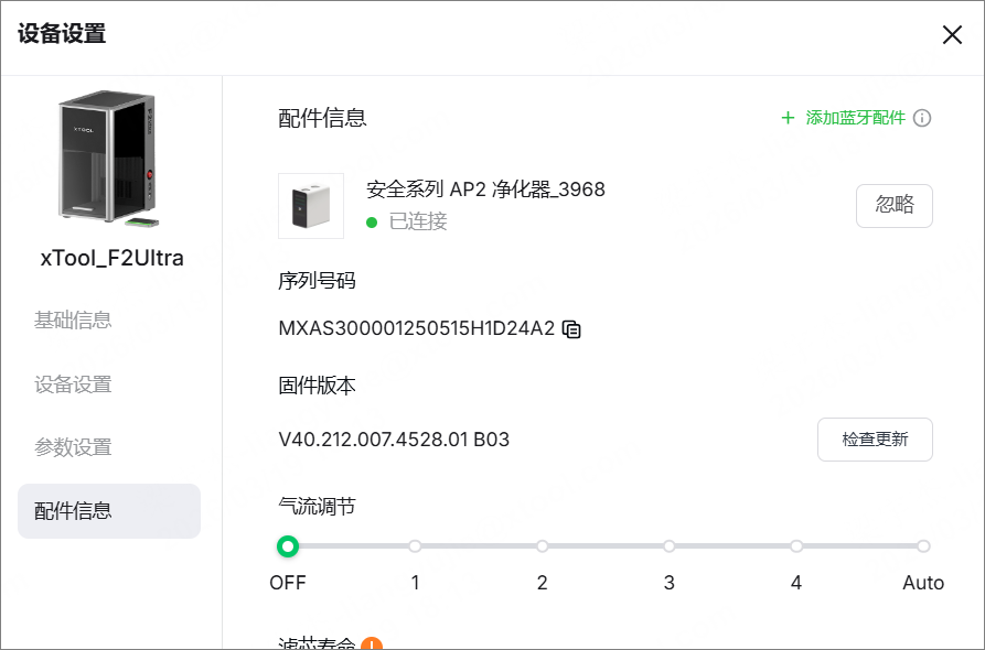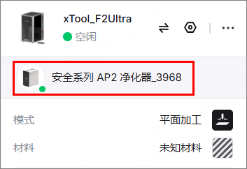 将净化器的蓝牙适配器插入 xTool 激光设备的扩展端口后,即可在 xTool Studio 上查看净化器信息,并手动设置气流级别。