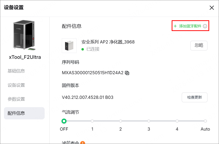 (2)在“配件信息”页面,点击“添加蓝牙配件”开启连接。注意,连接过程中,配件应尽量靠近激光机器。