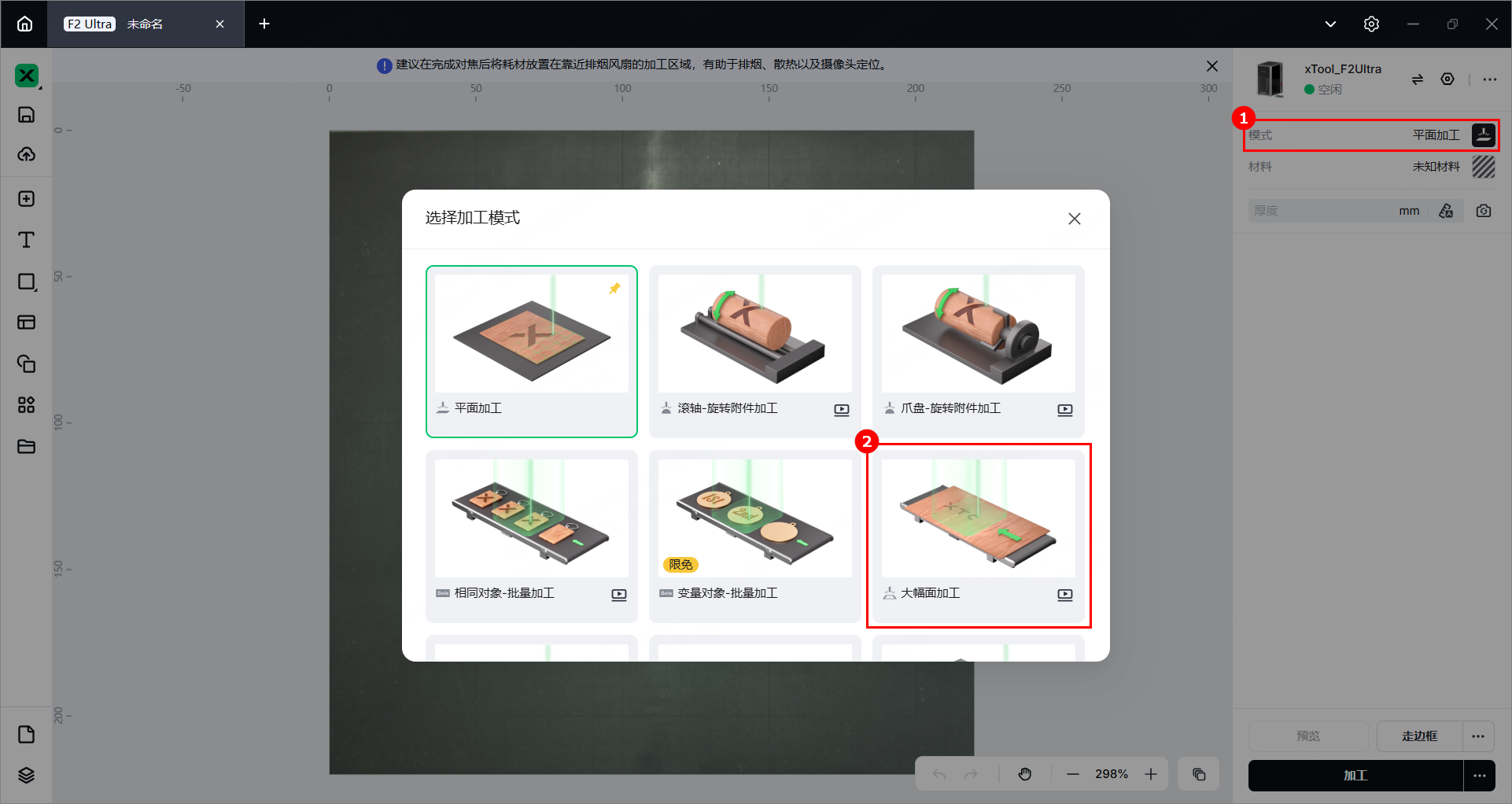 (1)在 xTool Studio 右上角,点击当前加工模式名称,在弹窗中选择“大幅面加工”。