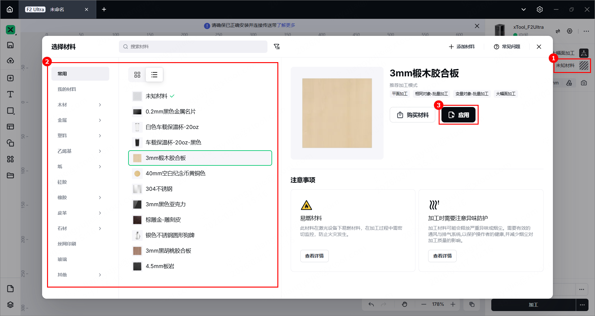 (2)在 xTool Studio 右上角,点击“未知材料”,选择你所用的材料的名称,然后点击“应用”。