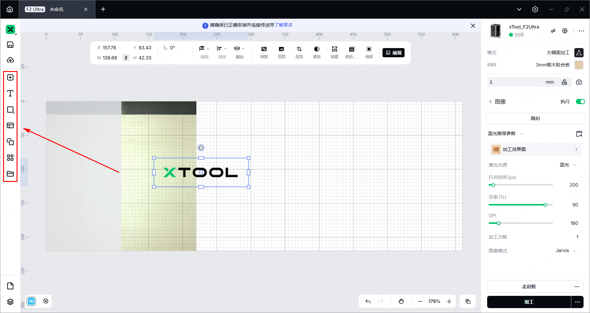 (2)使用画布左侧的工具,在材料上创建一个加工对象。你可以导入图像、插入图形、输入文字或绘制图案等。