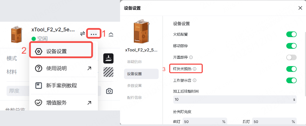 选择 “设备设置”。在弹出的窗口中,开启 “红外光预热” 功能。