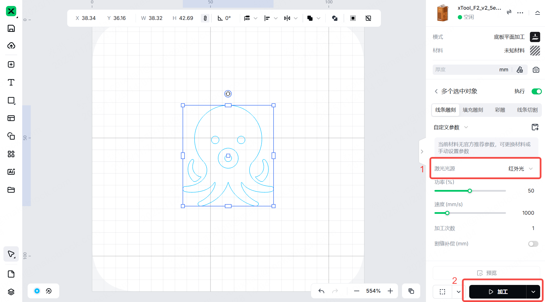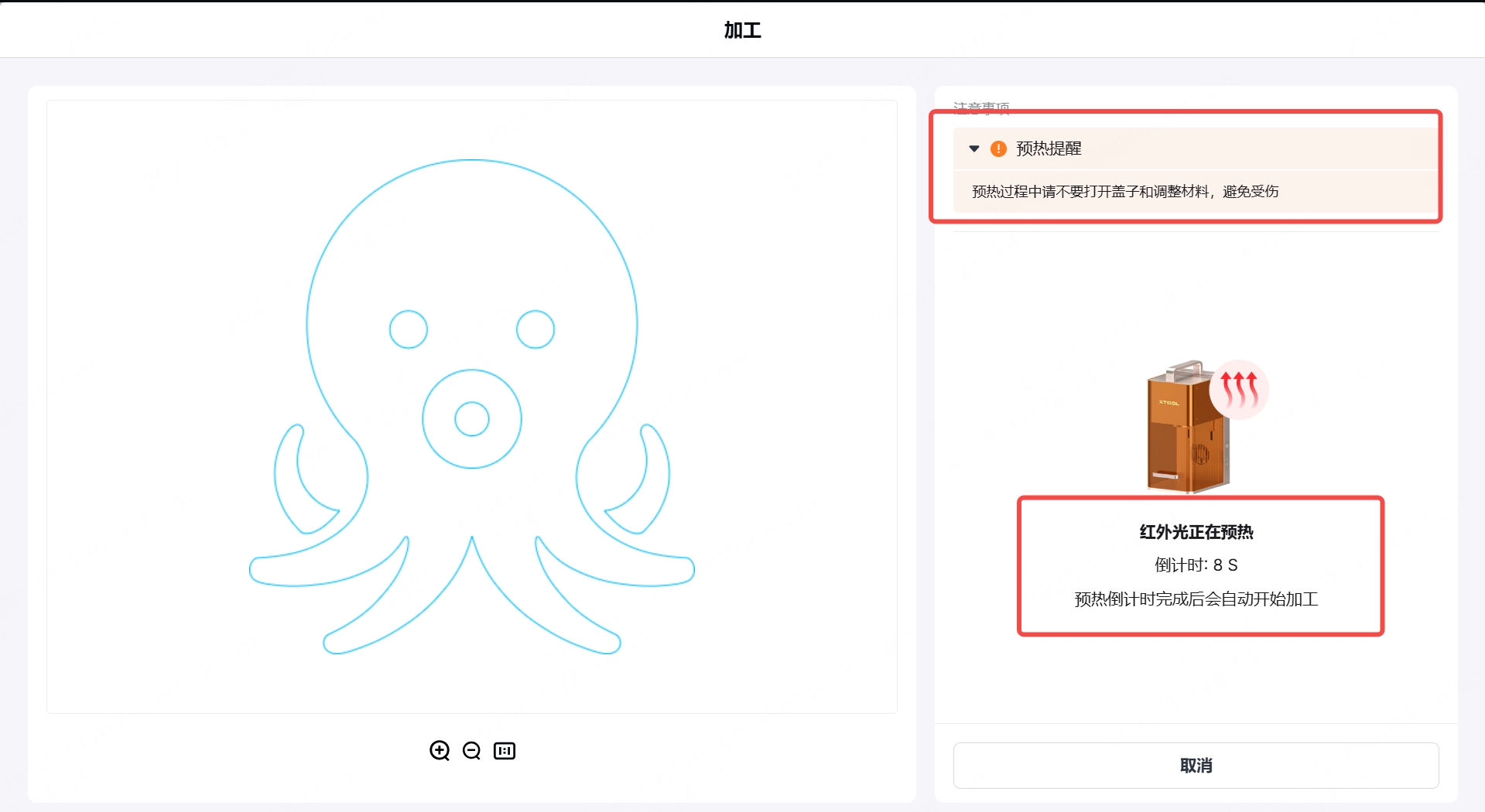 在软件中选择 IR(红外)激光类型 后,机器会在正式加工前自动预热约 10 秒。