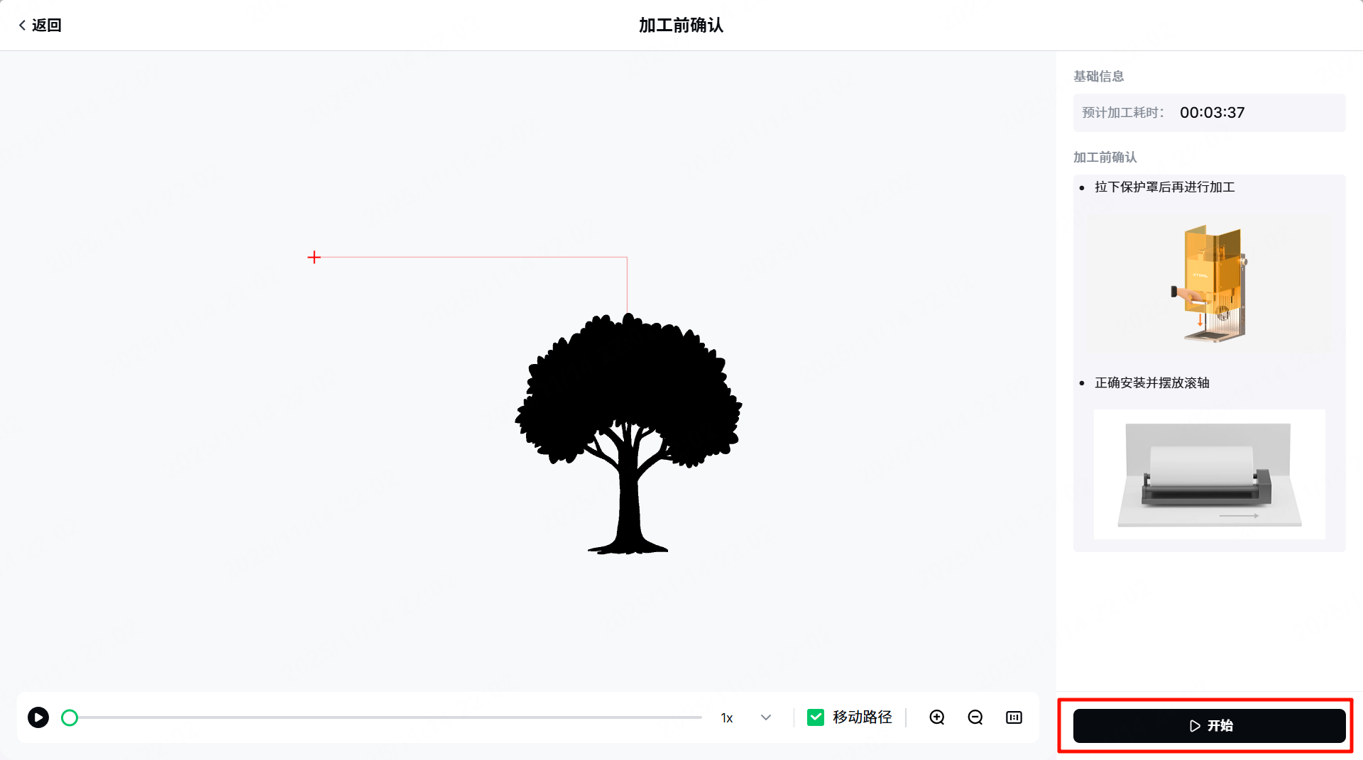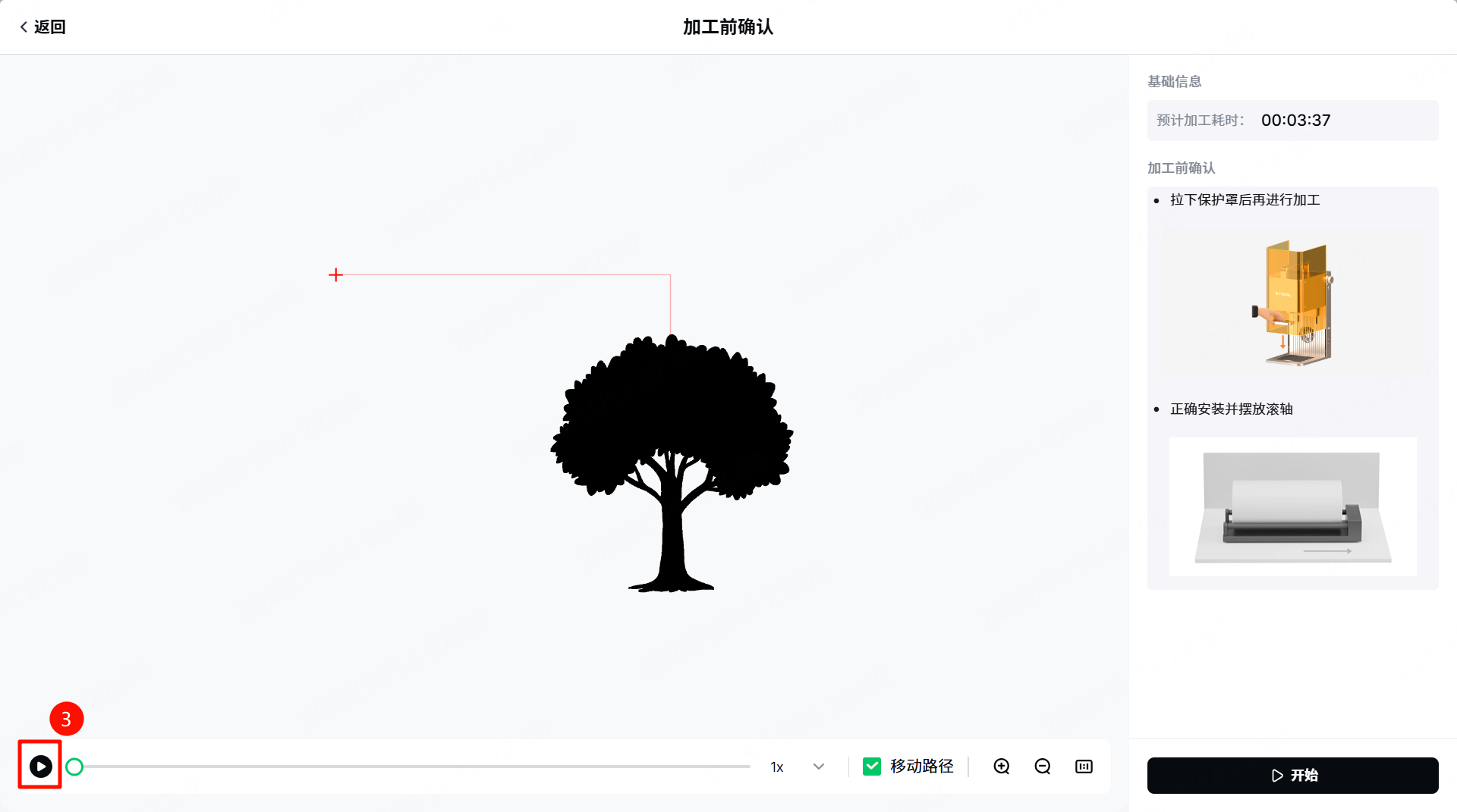 点击左下角的开始按钮,可观看加工路径模拟动画。在按钮右侧,你还可以设置“移动路径”的开启与关闭,以及动画速度的快慢等。