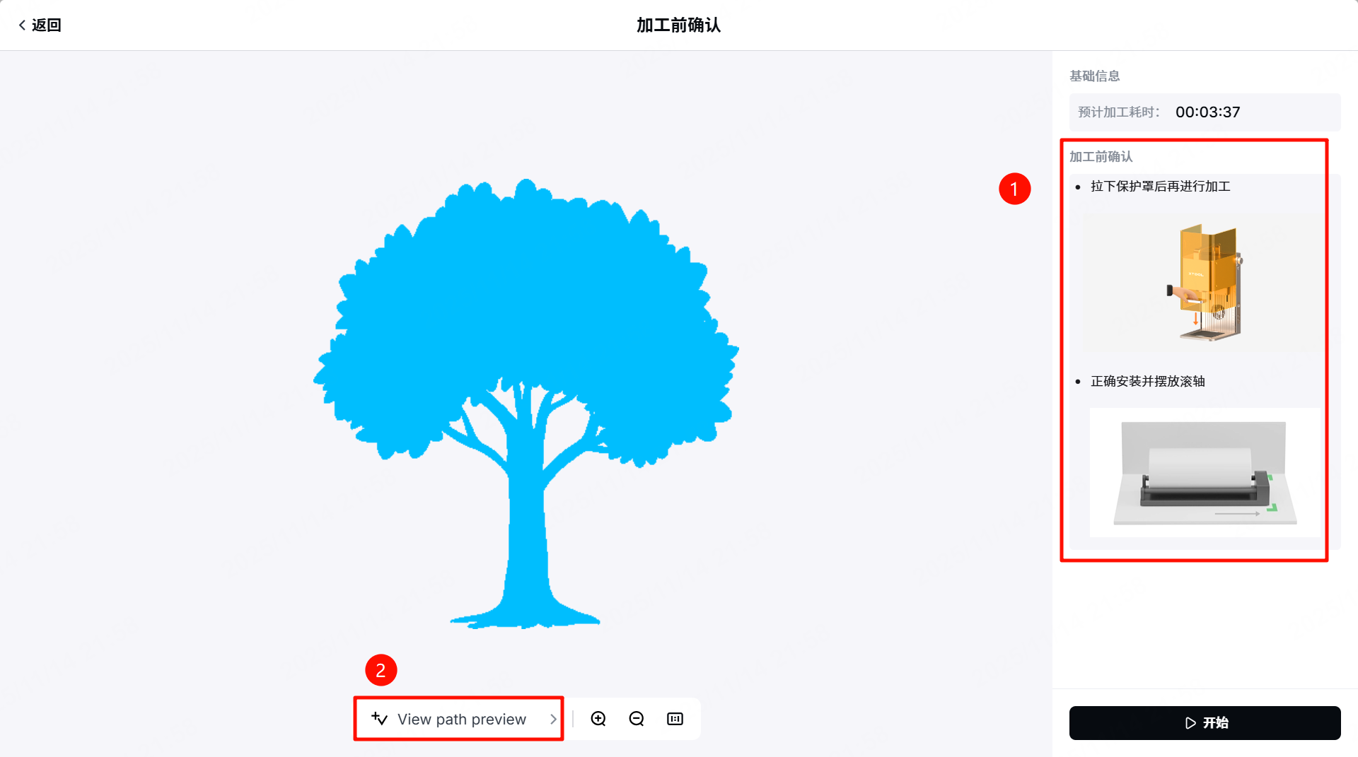 (4)在 xTool Studio 中点击“开始”。xTool Studio 显示“就绪”后,关闭 xTool F2 的防护罩,按一下触屏控制器上的加工按钮,开始加工。