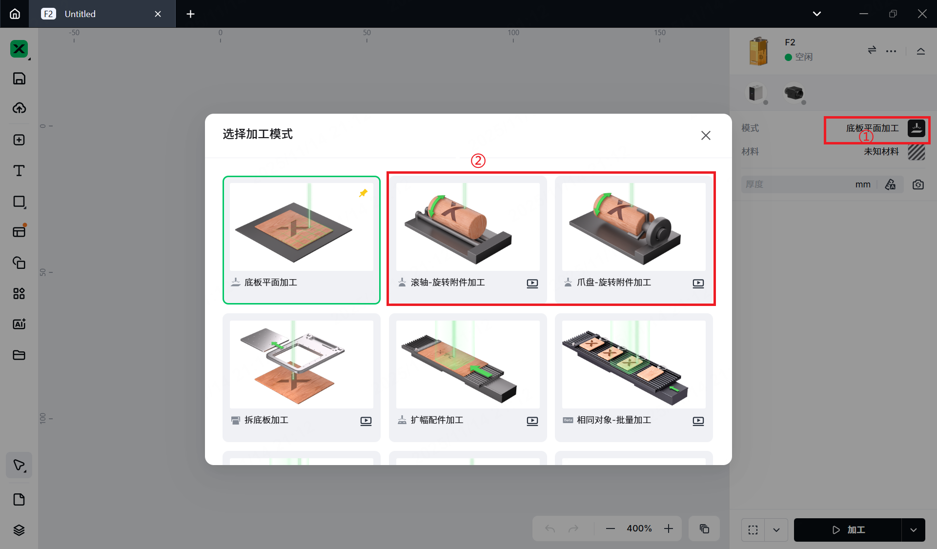 (1)在 xTool Studio 顶部,点击当前加工模式名称,在弹窗中选择加工模式。