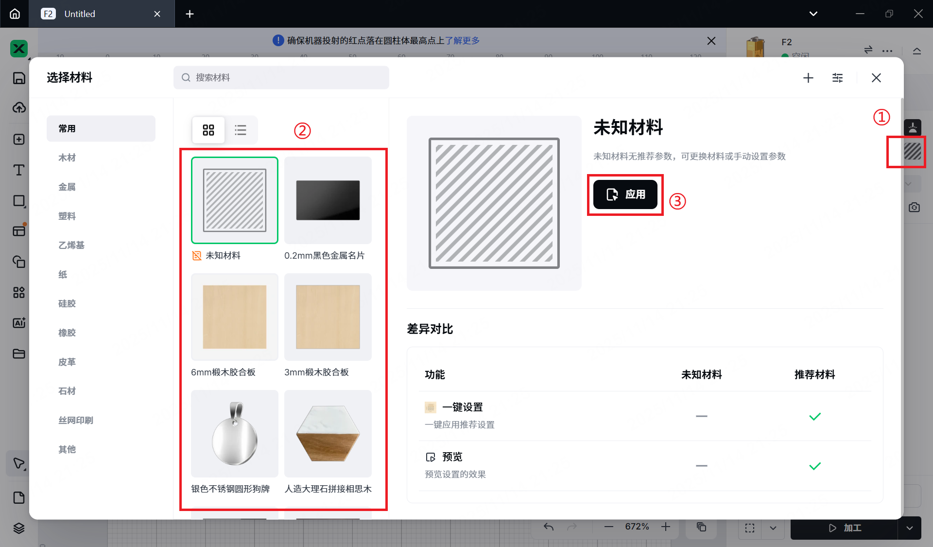 (2)在 xTool Studio 右上角,点击“未知材料”按钮,选择你所用的材料的名称,然后点击“应用”。