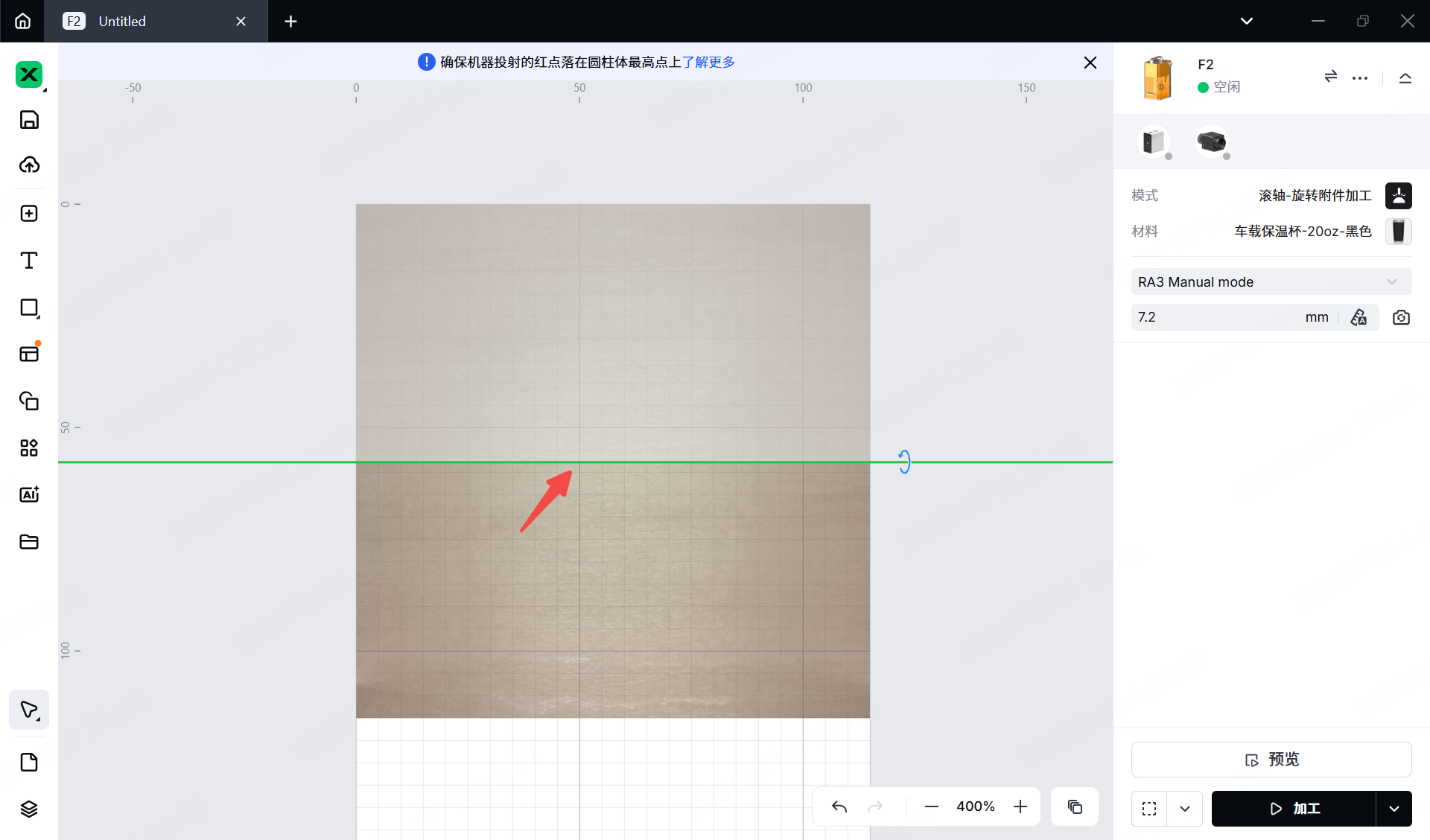 (1)确保指示光斑位于圆柱材料的最顶部。否则,请按照“连接旋转附件和 xTool F2”章节重新调整旋转附件的位置。
