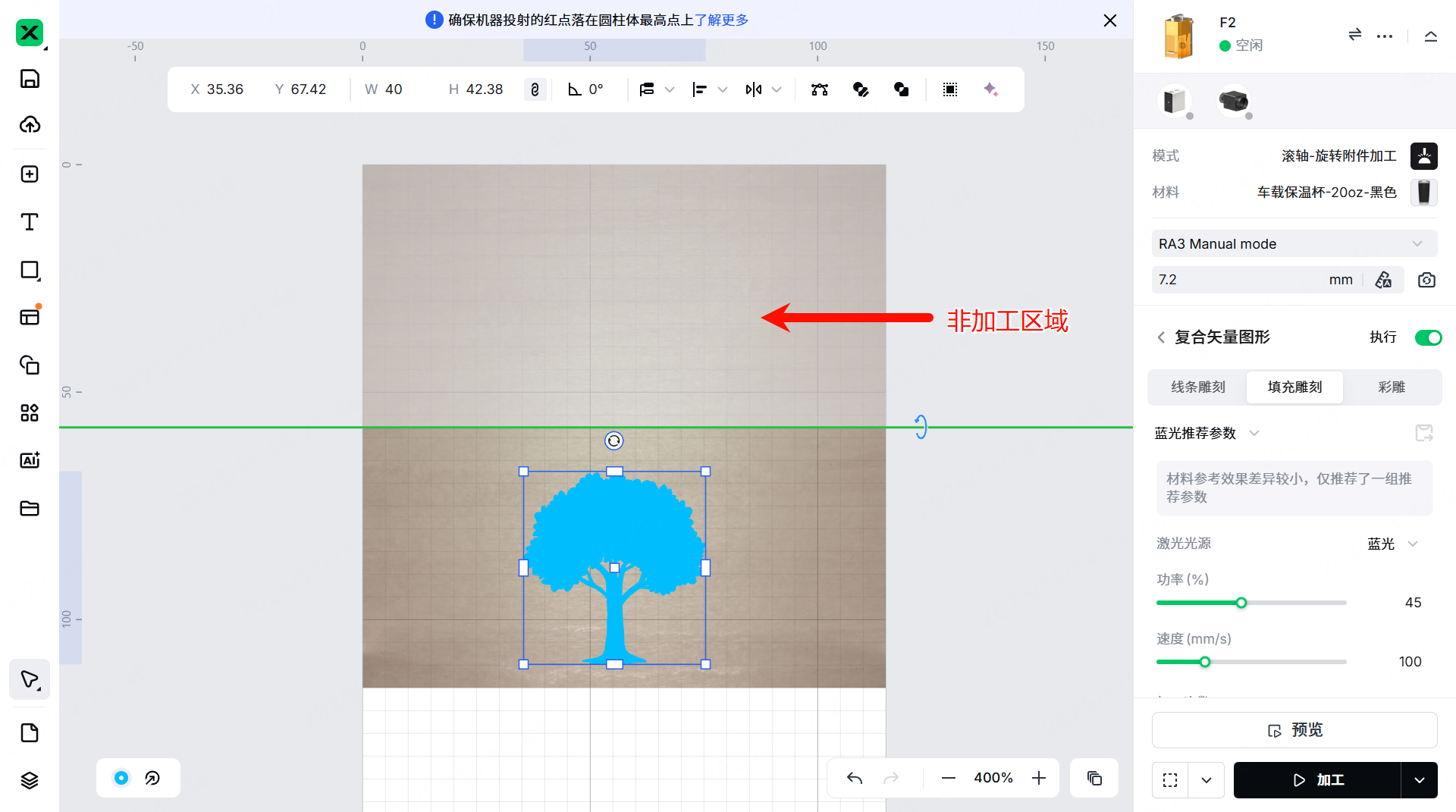 (3)在画布中绿色横线以下区域设计加工图案。使用画布左侧的工具可导入图像、插入图形、输入文字或绘制图案等。