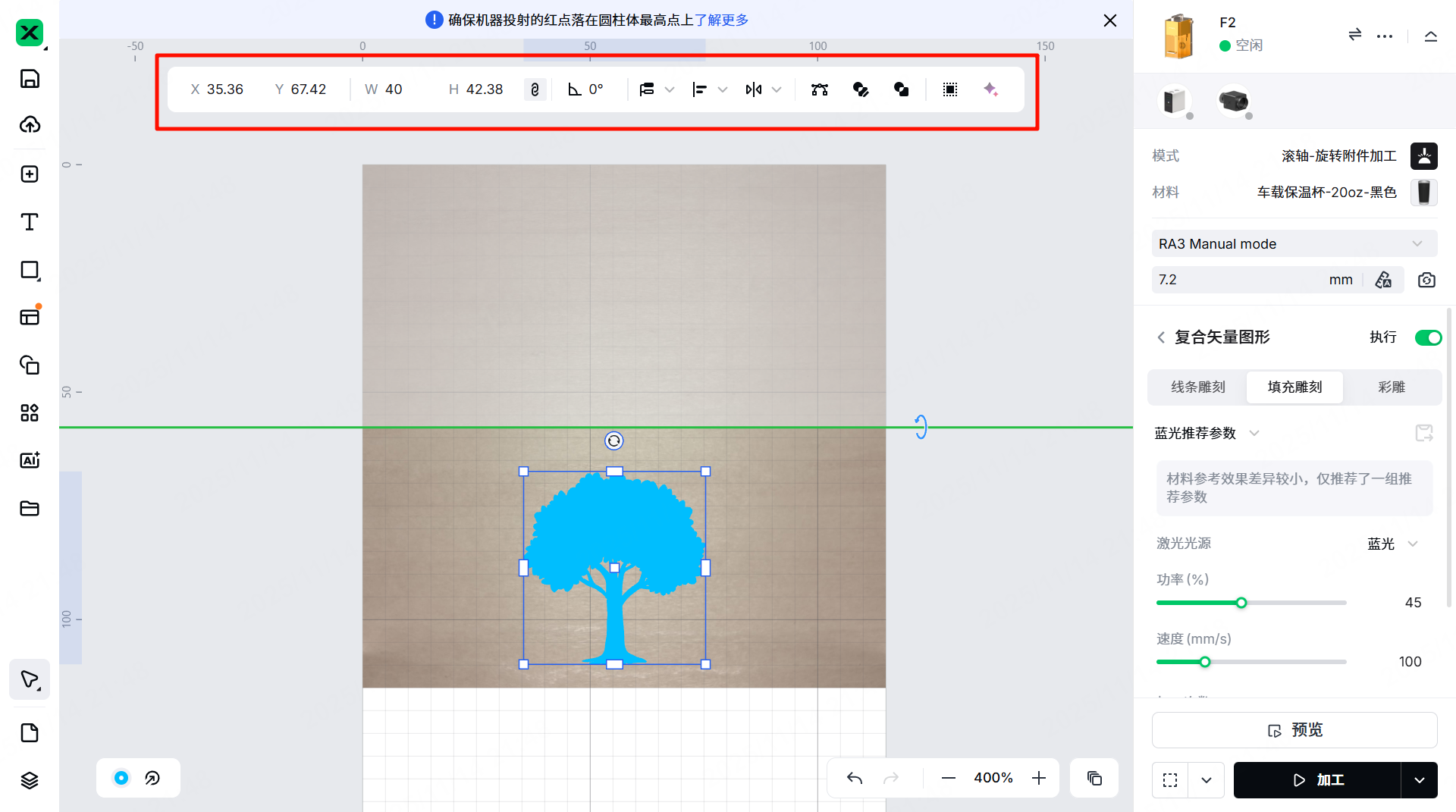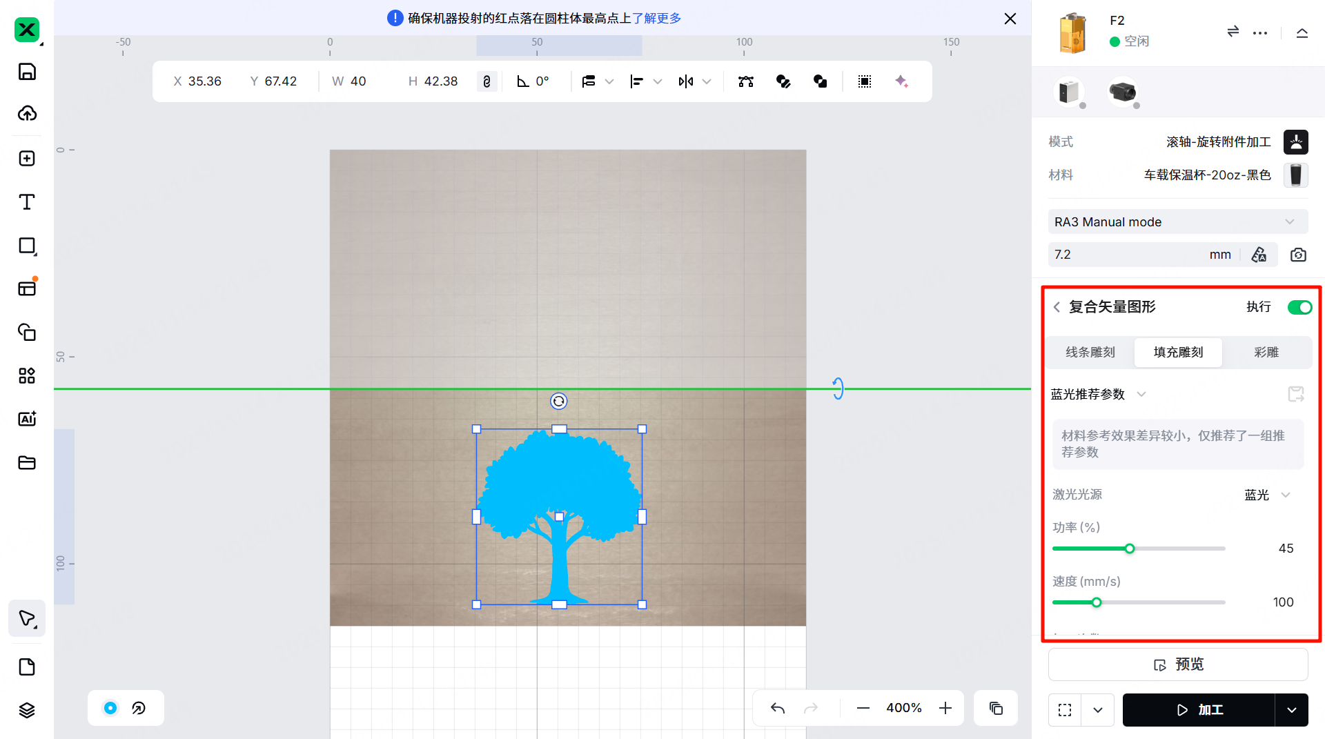 (1)选中画布中的对象,在画布右侧为选中的对象设置加工参数。