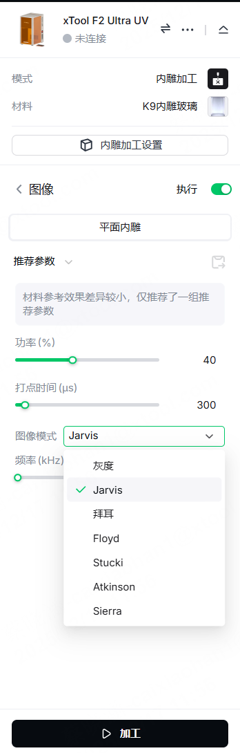 可以。要在玻璃内部雕刻 2D 图像(如照片、位图),请选择图像模式以获得最佳效果,例如 Jarvis 或其他模式。