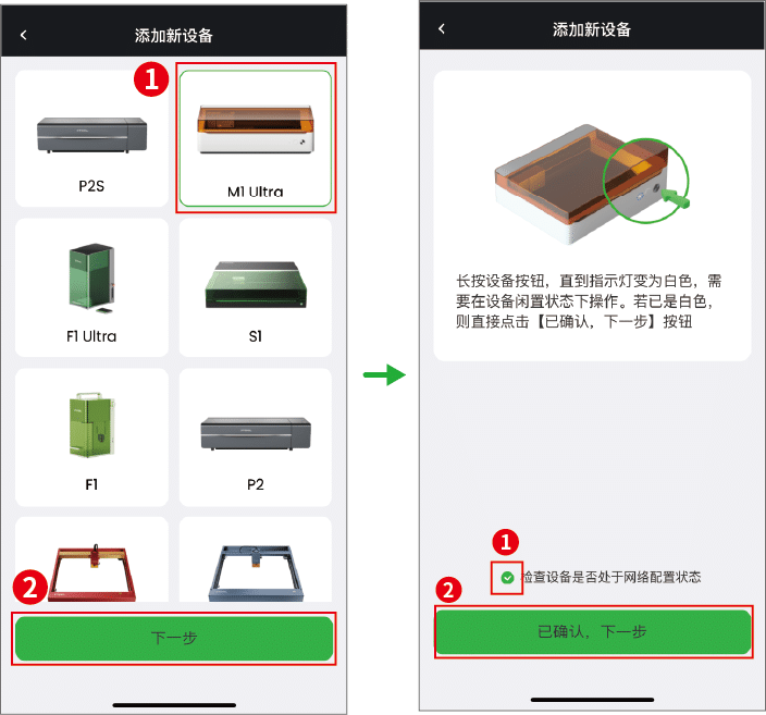 (2)确保 xTool M1 Ultra 接通电源并开启,点击“xTool M1 Ultra”>“下一步”。