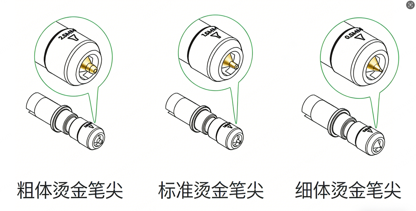 - 烫金笔通过其尖端施加压力,将箔材转移到下面的材料上。