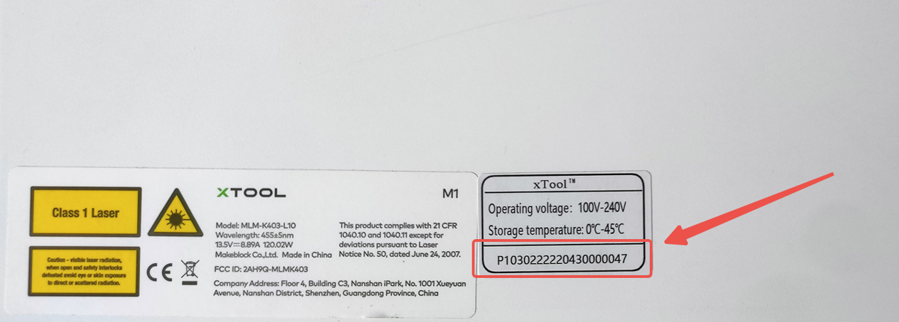 - 如果它晃动,请联系 xTool 客服以进行进一步诊断,并提供摆动模块的视频和 M1 的序列号 (SN)。请参阅 SN 的位置,请参阅下图。