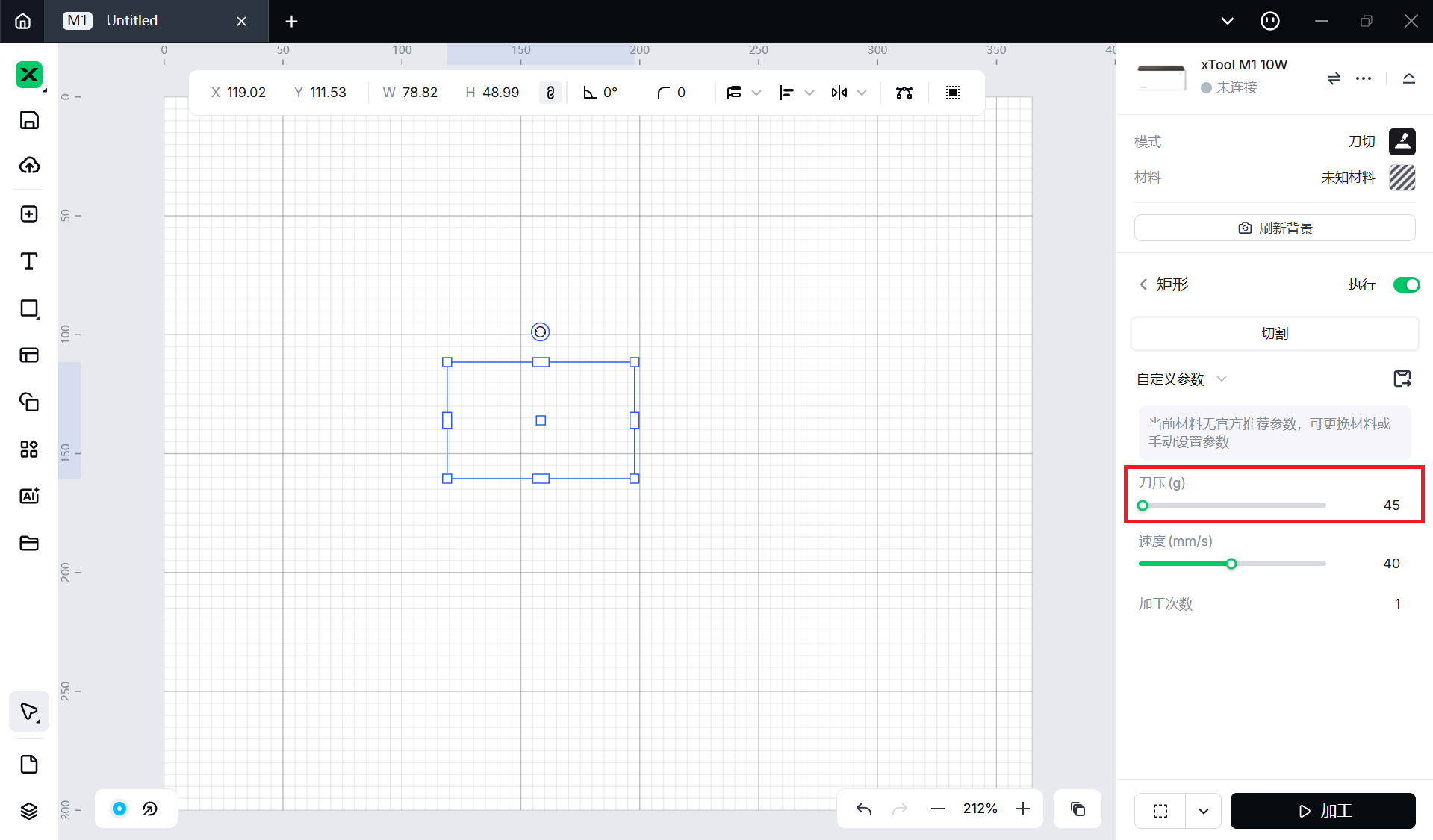 解决方法:刀片切割的理论最大加工厚度为 1.5mm。如果材料较硬,例如 1mm PVC 板、亚克力板等,即使使用最大切割压力也很难切割。对于这些材料,建议使用激光切割模式进行加工。