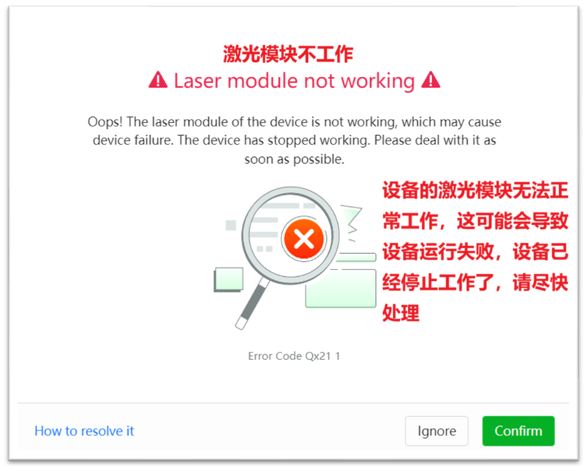 您将在 XCS 中看到一条弹出错误消息,指出激光模块不工作。