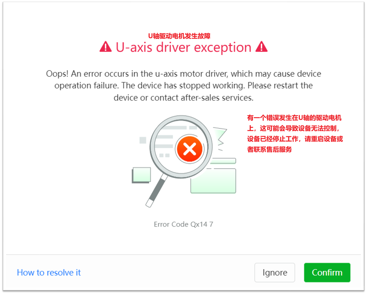 - 如果错误消息消失,则表示 RA2 电机出现故障。请联系 xTool 客户服务部进行更换。
