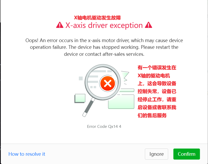 当此问题发生时,您将在 xtool Studio中看到一条弹出错误消息,指出 X 轴电机驱动器失败。