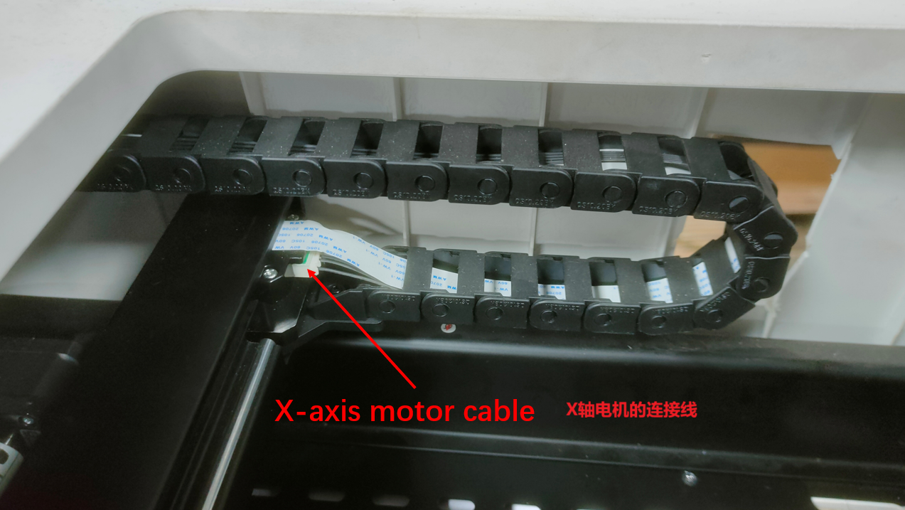 - 检查 x 轴电机连接线(见下图)是否松动地固定在插座上。