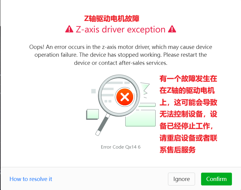 当此问题发生时,您将在 XCS 中看到一条弹出错误消息,指出 Z 轴电机驱动器失败。
