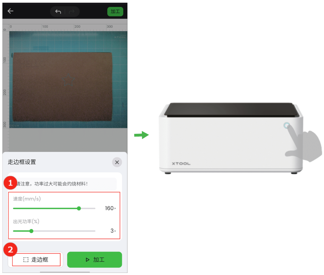 (2)设置走边框参数,点击“走边框”。关上 xTool M1 的盖子,按下 xTool M1 上的按钮开始走边框。激光光斑会沿着材料上加工样式的边缘移动,以便你预览加工区域。