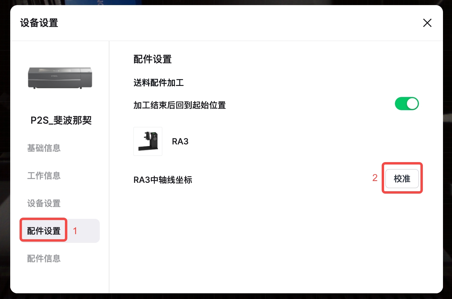 2. 点击“配件设置”,点击“RA3 中轴线坐标”右侧的“校准”。
