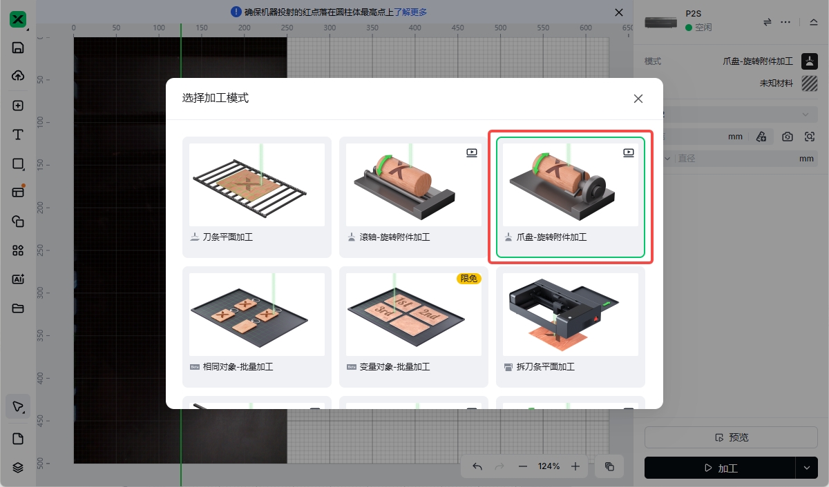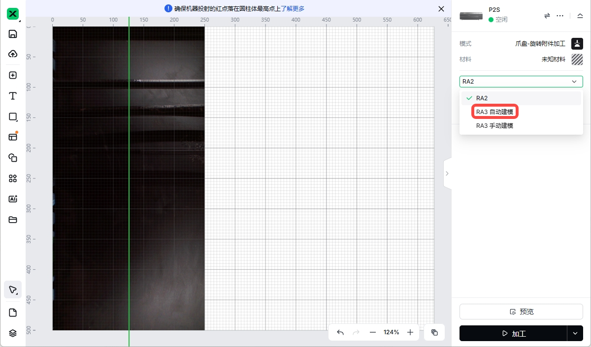 2. 当软件界面右侧的模式为“爪盘-旋转附件加工”或“滚轴-旋转附件加工”时,软件会自动识别 RA3。由于下文以爪盘模式为例进行介绍,因此选择模式“爪盘-旋转附件加工”。