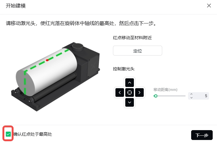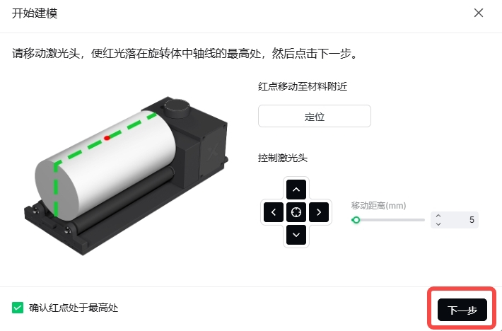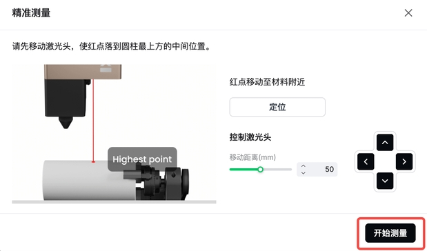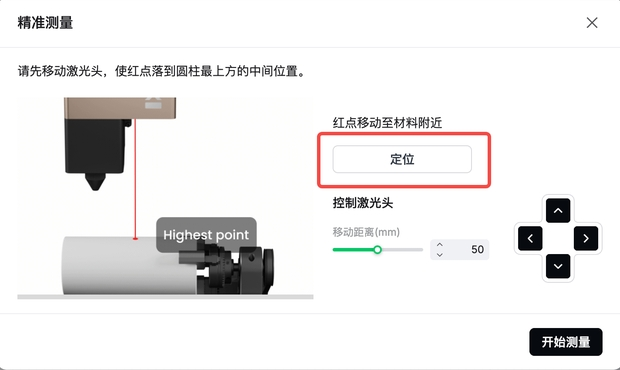 💡 若红点未落在工件中轴线的最高处,可在“移动距离(mm)”中输入数值(例如 5),然后点击上/下/左/右按钮进行微调。
